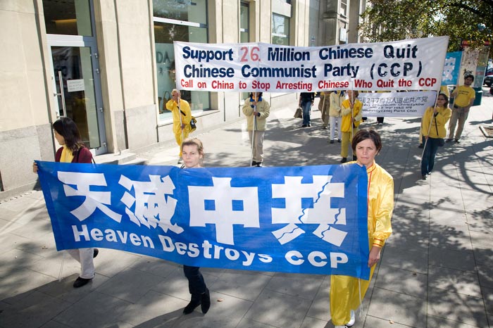![]() 游行队伍声援二千六百万退!党!,传递“天灭中共”的信息 |