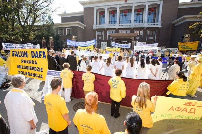 二零零七年九月二十二日清晨,数百名来自欧洲二十八个国家的部份法轮功学员,聚集在华沙市中心科学文化宫前的德菲拉德广场集体炼功。他们在广场上安详的打坐,整齐的排列出中文“正法”二字,整个广场被一股宁静、安详的气氛包围着。往来的路人不时驻足观看,并接过学员递上的真相资料和《·九·评*共产党》。欧洲《为你而来》合唱团也前来助兴,给华沙人民带来了三首保留歌曲。