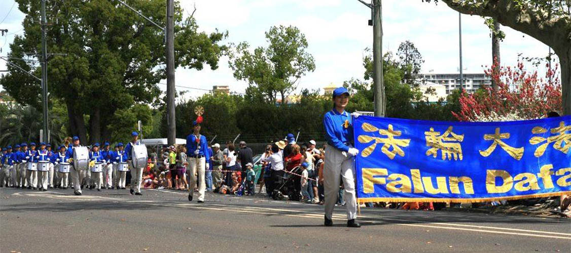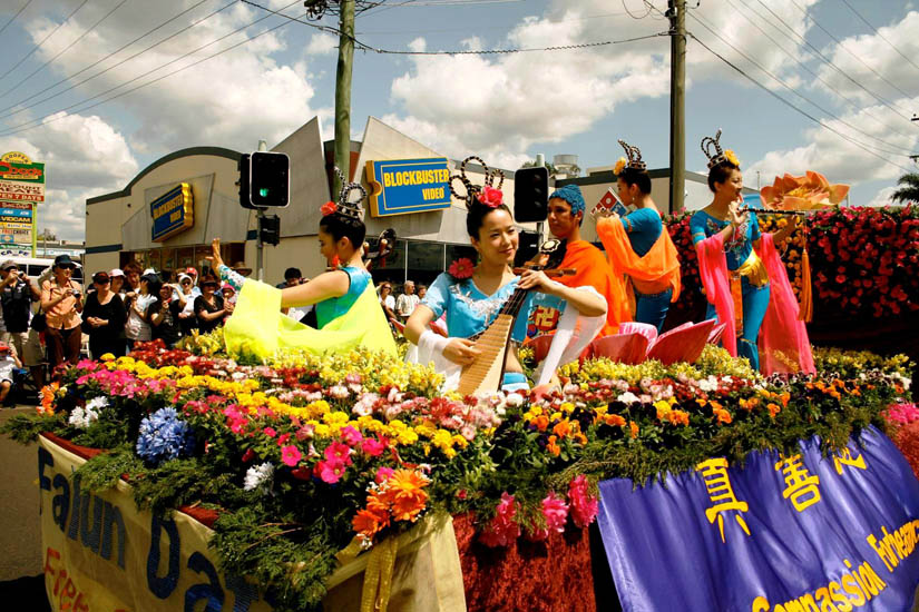 今年,法轮功学员将花车布置成一副“天国”的画面。坐在大莲花上的一尊佛手持金光闪闪的法轮,四周环绕着飞天与鲜花。队伍由“法轮大法好”横幅带领,游行方阵包括:由悉尼和昆士兰学员组成的“天国乐团”、仙女队、炼功队及腰鼓队。