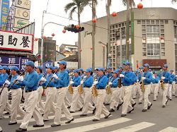 ![]() 天国乐团在踩街游行进行中画一整齐的步伐展现大法弟子的不凡风貌 |