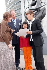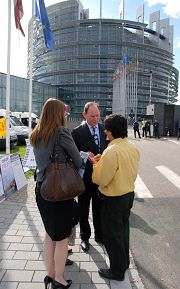 ![]() 欧洲议会副主席麦克米兰-斯考特与助手在欧洲议会总部前听取法轮功学员关于受迫害的介绍 |