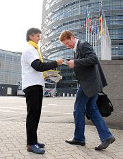 几天来,法国、德国的部份法轮功学员来到这座边陲小镇,在欧洲议会大厦前散发真相资料,呼吁制止中共迫害法轮功。