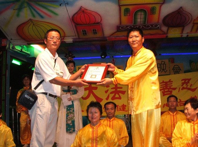 他希望每个人都有机会认识这么好的功法,在他推荐下,邻近的几个里长也纷纷邀请法轮功学员的腰鼓队和旗鼓队表演。因为每个里举办中秋晚会的日期不同,中秋假期腰鼓队等参加了北投区智仁里、中和里、丰年里、中央里等四个里的晚会演出。