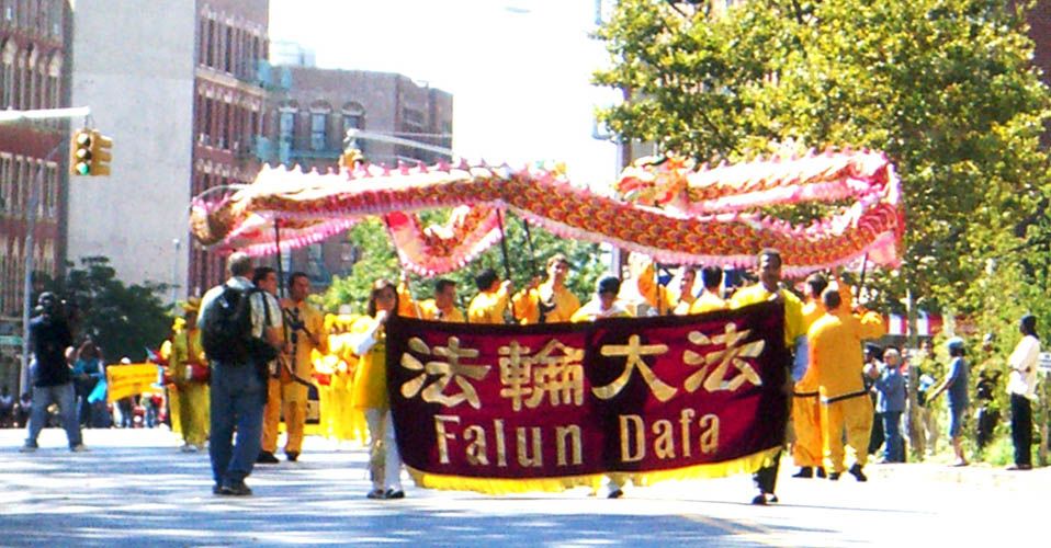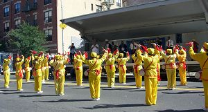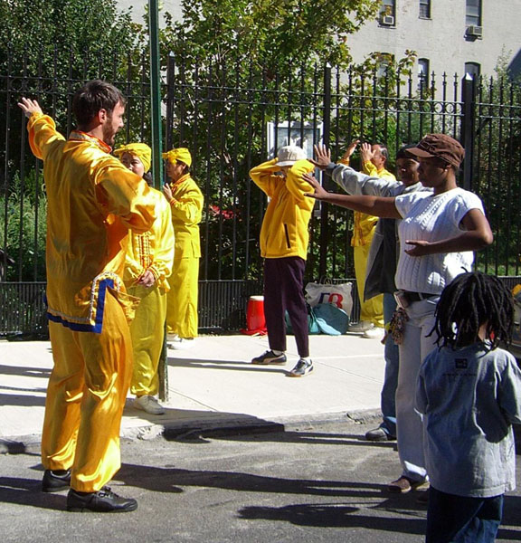法轮功学员组成的腰鼓和舞龙队伍参加了游行。学员们在游行前进行了集体炼功,不少人驻足观看,两位西人女士感觉很好,当场学功。
