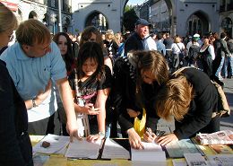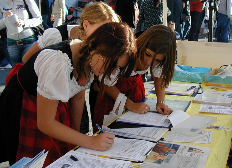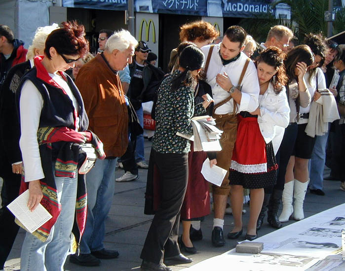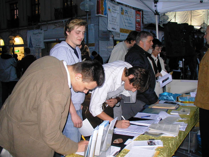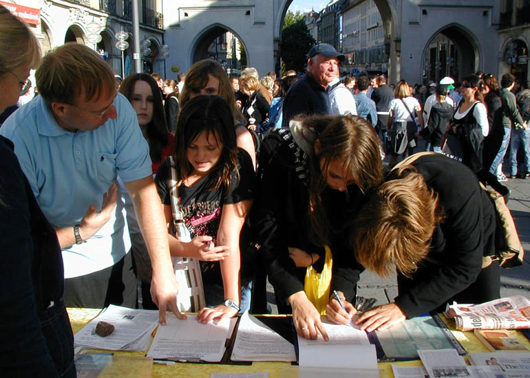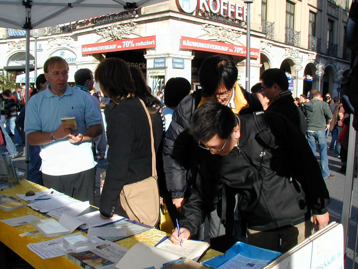 ![]() 三位身着巴伐利亚民族服装的少女,在观看了揭露中共罪行的图片之后,马上签名谴责中共活摘法轮功学员器官 |