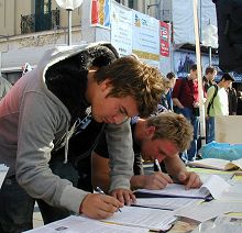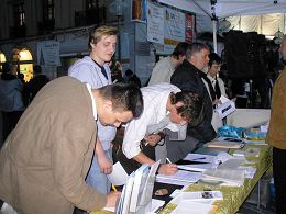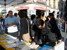 一位推着自行车的青年在展台前一直犹豫,他曾在中国工作过一段时间,对中国的情况有所了解。他很想签名,但因为马上要再到中国去工作而感到为难,他很担心签名会给他带来不必要的麻烦,可是他的良心又让他不安。他把想法告诉了一位在场的法轮功学员,承认他有私心。