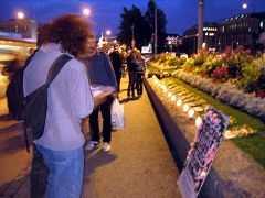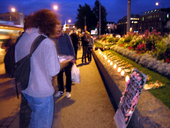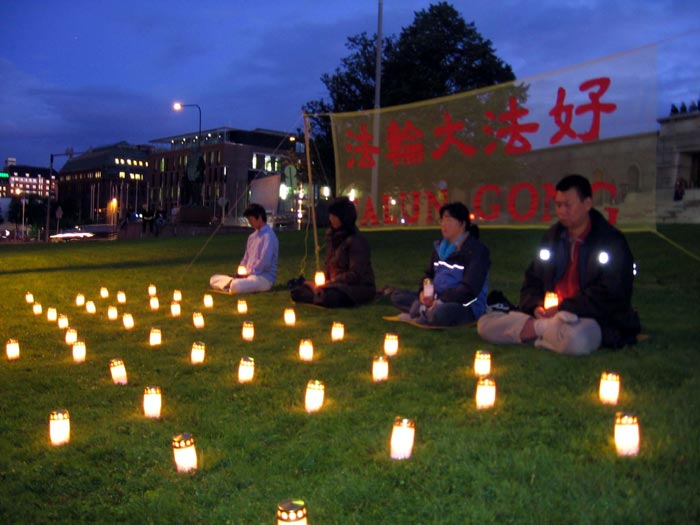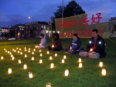 夜幕中法轮功学员在“法轮大法好”的横幅下,手捧烛灯盘坐在草坪上,静静的悼念死难的同修。人行道边的草坪护台上摆放着部份死难学员的遗像,一盏盏烛灯照亮着一张张善良坚毅的面庞。过往的行人不由得停住了脚步,接过学员递上的法轮功真相传单,就着路灯,一边阅读,一边思考,更有人上前向学员提问:法轮功是什么?为什么迫害法轮功?我想知道更多的情况…
