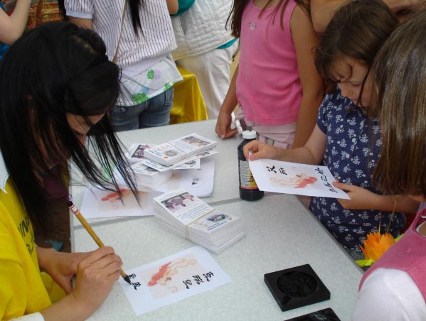 ![]() 许多观众得到了法轮功学员的书法作品 |