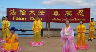 在蓝天碧海的衬托下,他们打出“法轮大法好”,“真善忍”横幅,他们演示了祥和的法轮修炼大法功法,同时以优美的“莲花舞”以及“扇子舞”展示了法轮大法的美好。