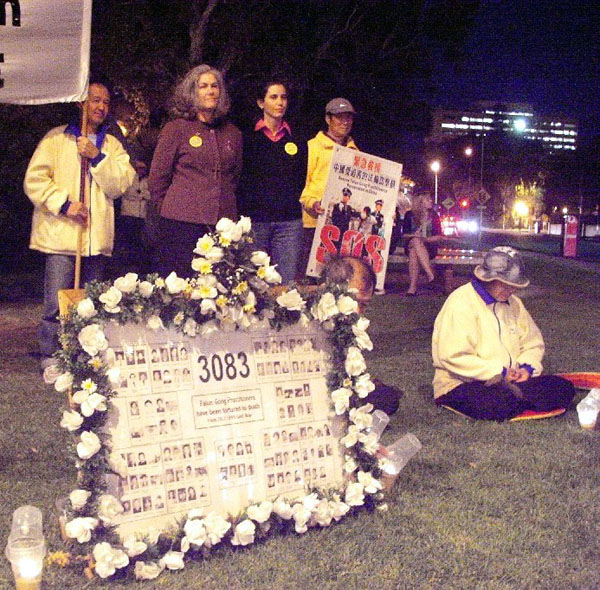 傍晚,当地法轮功学员陆续赶到现场,并在凯悦酒店前方举行了烛光夜悼,追思在中国因为坚持信仰“真、善、忍”而被中共迫害致死的法轮功学员。现场庄严肃穆的气氛引起了人们的瞩目,过路的驾驶人不时鸣笛以表示支持。