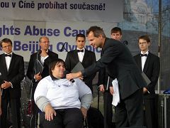 在发给路人的英文和捷克文传单中,引用了前捷克总统哈维尔的话:“我支持世界人权圣火的活动,我认为这是我们这个世界的希望。中共用巨额投资和巨大的奥运准备工程掩盖它对人权的迫害。中共政府没有实现它在申办奥运时作出的改善中国人权的承诺,现在让它遵守这个承诺是非常必要的。”