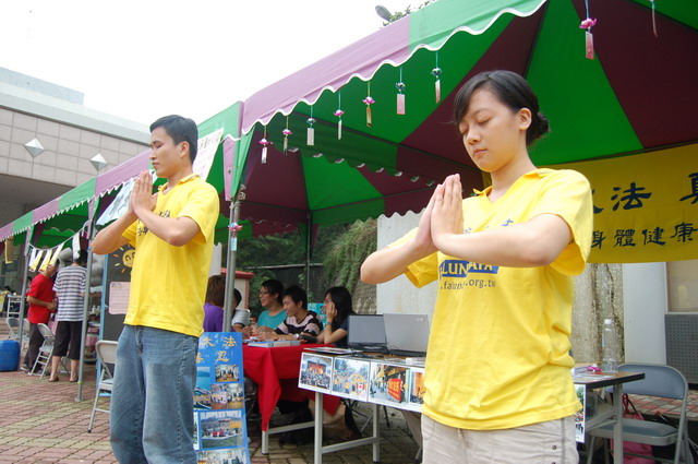 在这次中华大学社团博览会活动中,「法轮大法社」同学们所发出的「法轮大法好」小书签及真相光盘十分受欢迎,摊位前的功法演示更吸引了不少人驻足观看,并有人主动前来了解法轮功。