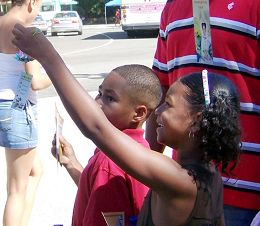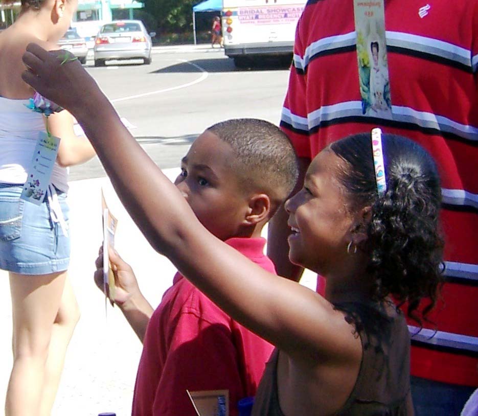 载有大法简介的莲花小书签最受游人喜爱,无论大人小孩都爱不释手。美籍越裔学员朱蒂和她的两个还在读书的儿子,一边忙着制作小莲花,一边忙着讲真相。华氏一百多度的高温和他们制作莲花的热情不相上下。朱蒂被问到这么热为什么总带着俩儿子来时,朱蒂说:“他们喜欢跟我来!”看到儿子在发资料时露出的一丝腼腆,朱蒂在旁边提醒道,“你要慈悲,你要想着给他们资料是为他们好。”