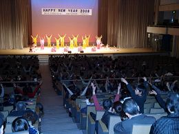 功法表演中台上台下浑为一体,强烈的能量场带动着台下的观众一起学炼功法。虽然只有十五分钟的表演,但“真、善、忍”的美好留在了人们的心中。