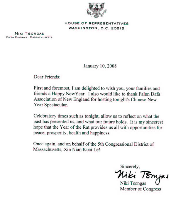 :全球华人新年晚会即将在波士顿上演之际,美国麻州第五区国会议员妮姬•桑格斯(Niki Tsongas)致函新英格兰法轮大法协会,祝晚会成功。