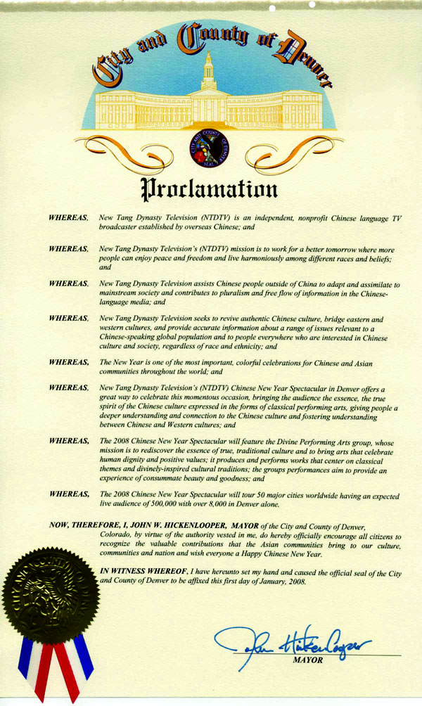 鉴于,新!唐!人:电视台在丹佛的中国新年晚会提供庆祝这一声势浩大的场合很好的方式,给观众带来以经典表演艺术表达的中国文化的精华和真正的精神,给人们与中国文化的更深的理解和连接,并促进中国和西方文化之间的理解;