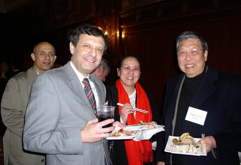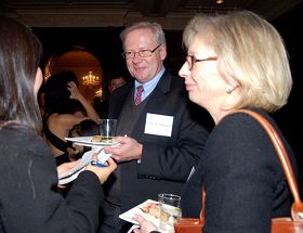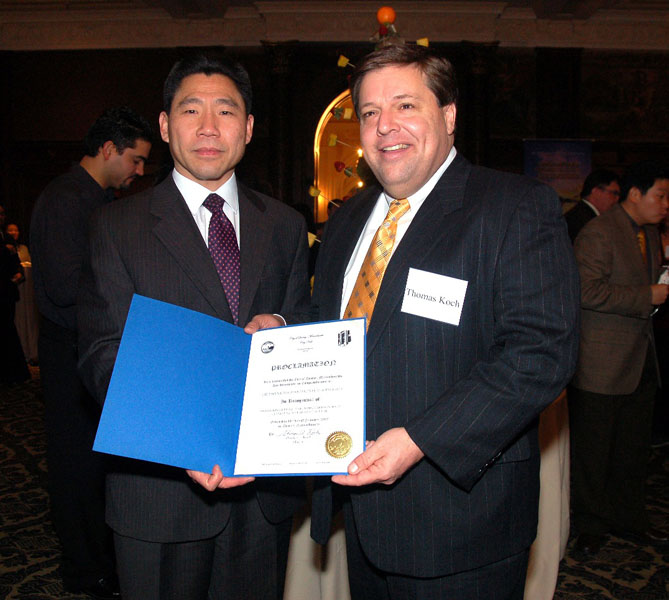 麻州昆士市新上任的汤姆·寇克市长与助手海伦.麦菲在晚会前贵宾招待会上颁发褒奖给新英格兰法轮佛学会。