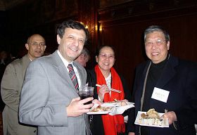 ![]() 麻州昆士市寇克市长(右)在晚会前贵宾招待会上颁发褒奖给新英格兰法轮佛学会。 |