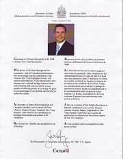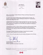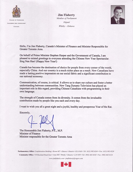 财政部部长吉姆•福莱赫提(Jim Flaherty)同时兼任大多伦多地区事务部长。他在贺信中表示,代表总理斯蒂芬.哈珀和加拿大政府,他非常高兴能够向每一位参加全球华人新年晚会的观众表示问候和祝贺。