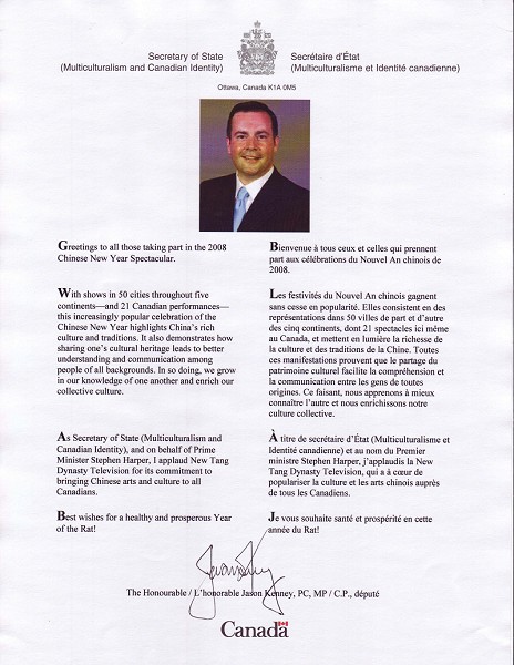 多元文化部部长杰森•肯尼(Jason Kenney)在他的贺信中表示,作为加拿大多元文化部长,他代表斯蒂文•哈珀总理,为新!唐!人:电视台所承担的责任和努力,将中国的传统文化和艺术带给加拿大而喝彩。