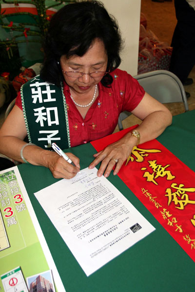 CIPFG亚洲分团团员陈昌辉,在立委选举活动正炽之际,邀请庄和子、江义雄、翁重钧各自签署「全球百万联署书」,表达对中共迫害法轮功学员的严重抗议。立委庄和子表示,中共戕害人权的罪行令人发指,长期以来对法轮功学员残害、打压,甚至活体摘取器官,让人感到非常痛心。
