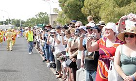 虽然天气酷热,但游行队伍和观众依然兴致不减。“法轮大法”的横幅和法轮大法学会主办“神韵晚会”的横幅,在整个游行队伍中格外引人注目。许多观众也拿到了“神韵晚会”的传单,并表示要去观看。