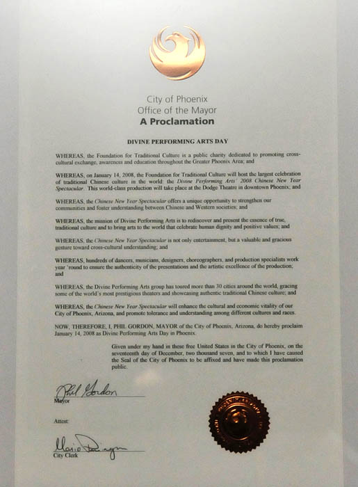 因此,我,亚利桑那州凤凰城市长菲尔-高登(Phil Gordon)此宣布二零零八年一月十四日为凤凰城“神韵艺术日”。