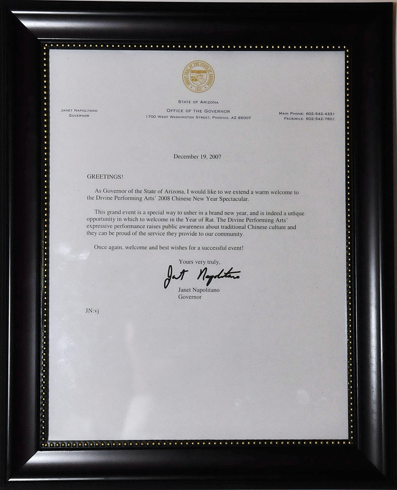 州长Janet Napolitano在信中说,作为亚利桑那州的州长,我向神韵艺术团带来的二零零八年全球华人新年晚会表达热烈的欢迎。