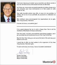 :全球华人新年晚会。一月九日,蒙特利尔市长谭保利(Gerald Tremblay)、沃顿区议员、魁省政府内阁副领袖亨利•佛朗索瓦•格特林(Henri-Francois Gautrin)纷纷给晚会发来贺信。