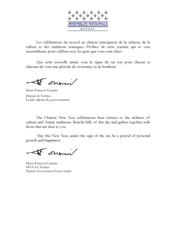 沃顿区议员、魁省政府内阁副领袖亨利•佛朗索瓦•格特林发来贺信,祝大家在新的一年更加成熟、更加幸福。
