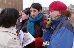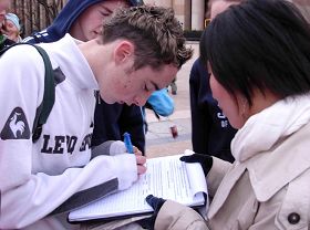 来自爱尔兰的学生们知道真相后,听说是有关反迫害的征签,争着要签名,并且很认真的问“这儿我要把姓名全写上是吗?”甚至他们的领队告诉他们要走了,他们还是坚持把自己的正义支持留在了征签表上。