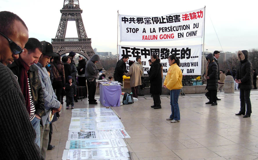 小小的展台上放着用各种语言讲述法轮功真相的小册子,中、法文报纸等资料;用中文和法文写着“中共邪*党-停止迫害法轮功”、“正在中国发生的……”的两幅标语展现在经过人权广场的人们面前;一幅幅揭露中共酷刑迫害法轮功学员的图片在地上整齐的摆放着。几位法轮功学员手拿真相资料和征签表用不同的语言向人们讲述真相,为反迫害征签;十几位平静祥和、年纪各异的法轮功学员微闭双目,在风中平静的炼功。没有麦克风,这幅朴实的画面,一如“请与我比邻而坐”的歌词所述: