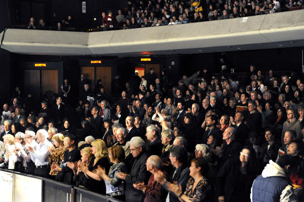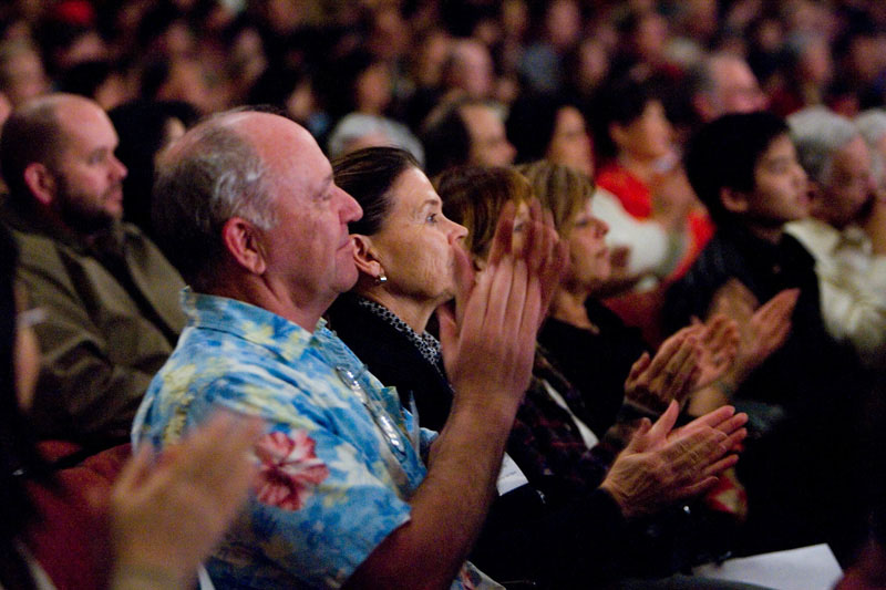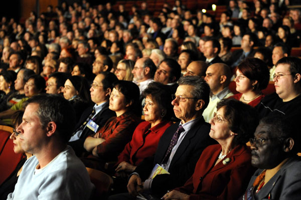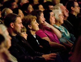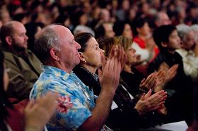 ![]() 加拿大蒙特利尔的观众们聚精会神的观赏“神韵巡回艺术团”的演出 |