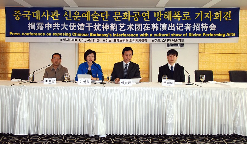 在此之前,十五日,神韵晚会韩国主办方「索纳塔艺术企划公司」在首尔「新闻中心」(PRESS CENTER)举行新闻发布会,强烈谴责中共向韩国输出文化恐怖主义,破坏中华正统文化。