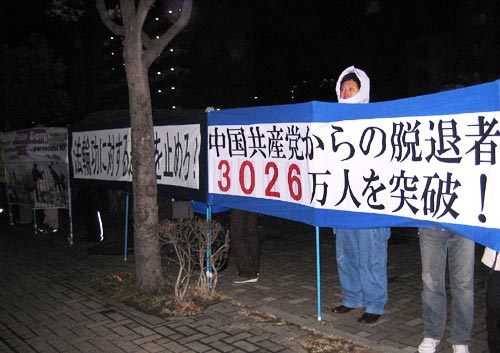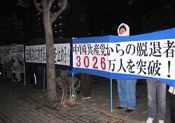 当天是日本入冬以来气温最低的日子,风也很强,天空还不时飘着雪花,但是法轮功学员们不畏寒冷,精神饱满的打着横幅“法轮大法好!”“停止迫害法轮功”以及标着三千万退!党!人数的大横幅,吸引着过往路人的关注。