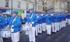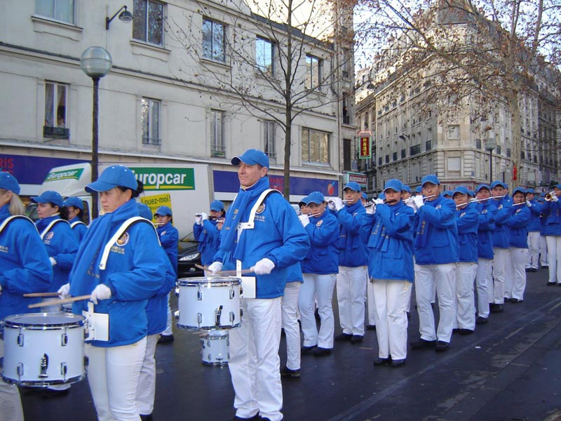 早上的巴黎还在阴雨朦胧中,天国乐团的成员已经列队整齐,整装待发。游行队伍在一片爆竹声之后出发。当天国乐团的第一首乐曲吹响,一道清丽的音乐划破长空,云开了,雨停了,学员们蓝色的上衣和白色的长裤与蓝天白云相映,让人耳目一新。演出的乐曲有“法轮大法好”、“法鼓法号”、“法正乾坤”,还有人们熟悉的贝多芬的“欢乐颂”。人们听着音乐,脸上露出了笑容。