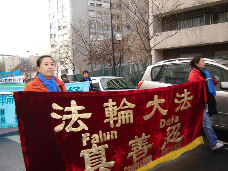 在游行中,法轮功学员用高音喇叭向路边的人们用中、法文讲述法轮大法洪传世界的盛况,并揭露中共对法轮功的迫害。法轮大法带给人们“真、善、忍”,令亿万人身心升华。中共对法轮功学员进行了八年多的迫害,无数善良的修炼者被强行洗脑,被施酷刑,中共邪*党-还活摘法轮功学员的器官,杀人以牟取暴利。