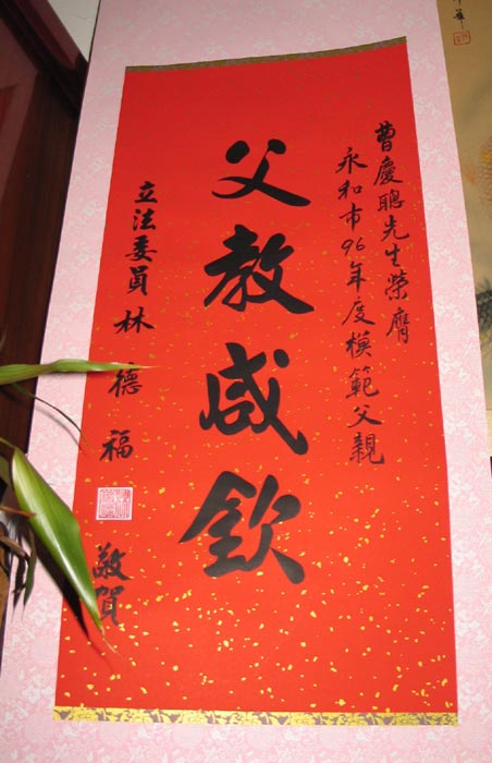 ![]() 二零零七年获得台北县永和市「模范父亲」的匾额 |