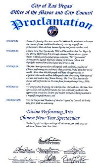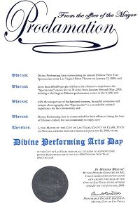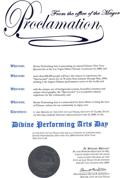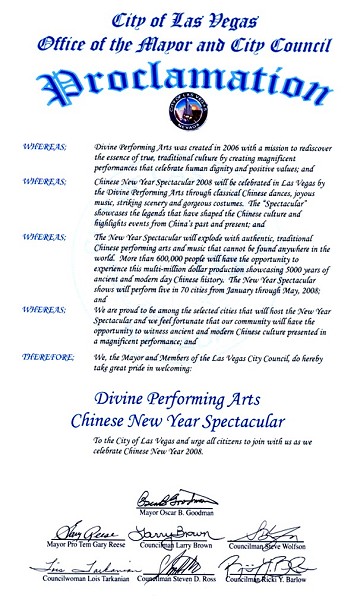 “我对神韵艺术团将中华文化最美好的精华带到拉斯维加斯表示赞赏。在此,我非常荣幸以拉斯维加斯市长身份宣布二零零八年一月二十一日为‘神韵演出日’,同时希望所有市民都能够一同欣赏神韵艺术团与全球华人新年晚会。”