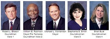 ![]() 北拉斯维加斯市议会成员。左起:罗伯特•伊利亚逊、威廉•罗宾逊、迈克尔•蒙坦顿(市长)、斯蒂芬妮•史密斯、莎莉•巴克。(图片来源:市议会官方网站) |