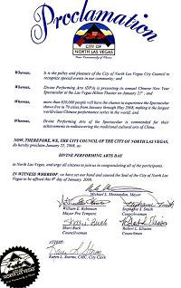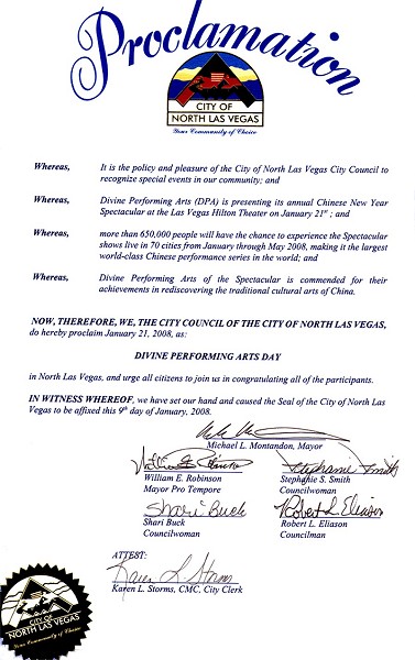 市议会赞扬神韵艺术团复兴中国正统文化的成就,“呈现该演出的神韵艺术团,他们因恢复中国传统文化艺术的成就而受到赞赏,因此,北拉斯维加斯市议会特此宣布,二零零八年一月二十一日为“神韵艺术团日”。
