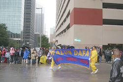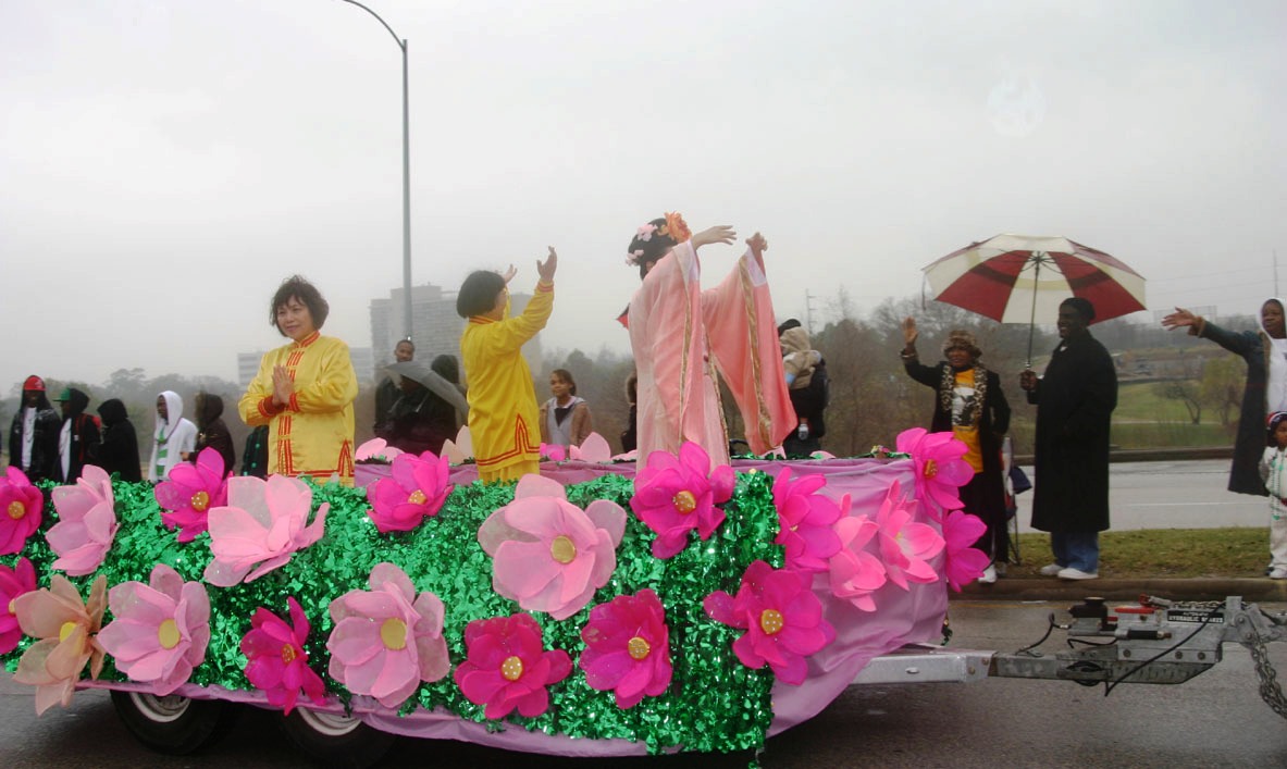 游行从Allen Parkway(与Montrose交界)起步,绕市中心两圈,约一点五英里。尽管活动期间细雨绵绵,沿着游行路线仍布满了观众。当法轮功队伍的“法轮大法”横幅一出现,马上就有一些观众高呼:“法轮大法”。由德州法轮功学员组成的天国乐团,是首次在马丁·路德·金大游行中亮相,他们神采奕奕,格外引人注目。花车上身着黄色炼功服或身着唐装的法轮功学员展示着功法,“缓、慢、圆”的动作吸引着观众。录影机,照像机都聚焦法轮功队伍。而“揭露中共迫害”的反酷刑展(模拟展示)更引人注目,两侧横幅“酷刑正在中国发生”震撼着观众的心。如此平和美好的功法却在中国受到打压,许多观众都表示不可思议,纷纷索取资料了解更多详情。