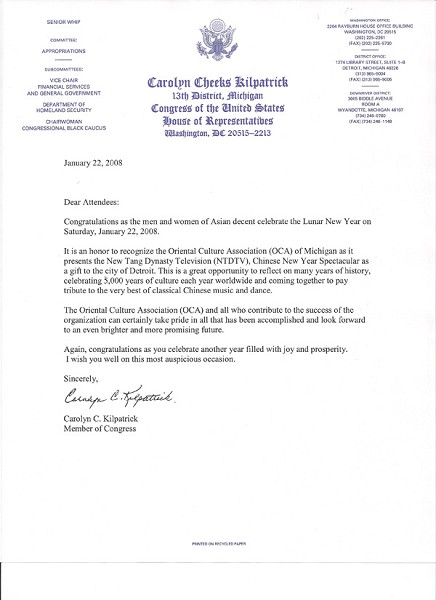 ![]() 国会议员卡罗琳•基尔帕翠克(Carolyn Kilpatrick) | ![]() 国会议员卡罗琳•基尔帕翠克(Carolyn Kilpatrick)发来的贺信 |