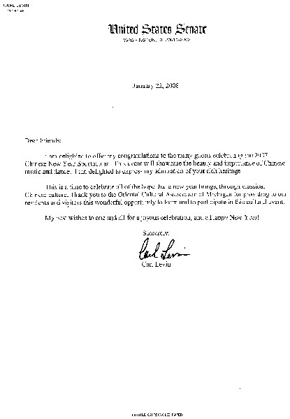 参议员卡尔•莱温(Carl Levin)在信中说,“这一晚会将展现中华音乐舞蹈的优美和内涵。我很高兴能够在此表达我对中华丰富多彩文化传统的羡慕。”他感谢主办方密西根东方文化协会为密西根居民和客人“带来学习和欣赏这一绝好文化演出的机会。”