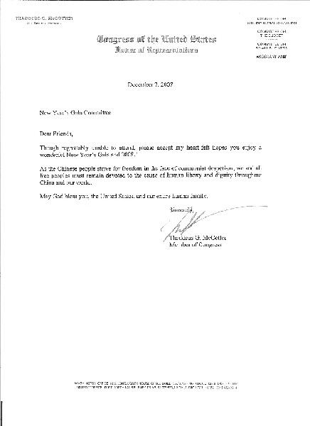 国会议员萨德斯·迈卡特(Thaddeus McCotter)在贺信中表示他感到很遗憾不能亲临观赏新年晚会,但他衷心祝愿华人新年晚会演出成功,并祝各位二零零八年万事如意。他还在信中说:“中国人民在共产党的专制统治下仍在不断争取自由,我们及所有自由世界的人们必须支持中国及全世界人民为人类自由和尊严所作出的努力。”“愿上帝保佑你们,保佑美利坚,保佑整个人类大家庭。”