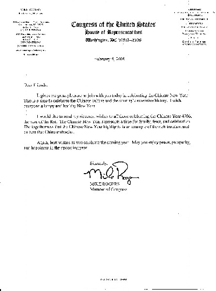![]() 国会议员迈克•罗杰斯(Mike Rogers) | ![]() 国会议员迈克•罗杰斯(Mike Rogers)发来的贺信 |