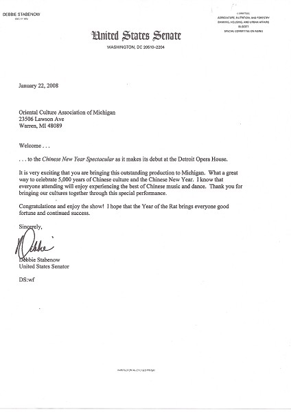 参议员玳碧•斯戴比娜在致密西根东方文化协会的信中说,“你们为密西根推荐的这一优秀演出令人振奋。这是庆祝中华五千年文化和中国新年的一种绝好方式。我相信每一位参加这新年晚会的观众都会欣赏和喜爱中华音乐和舞蹈的精粹。感谢你们通过这一不同凡响的演出为我们的文化带来新的内容。”