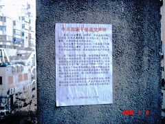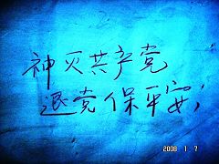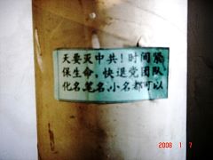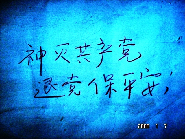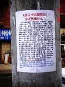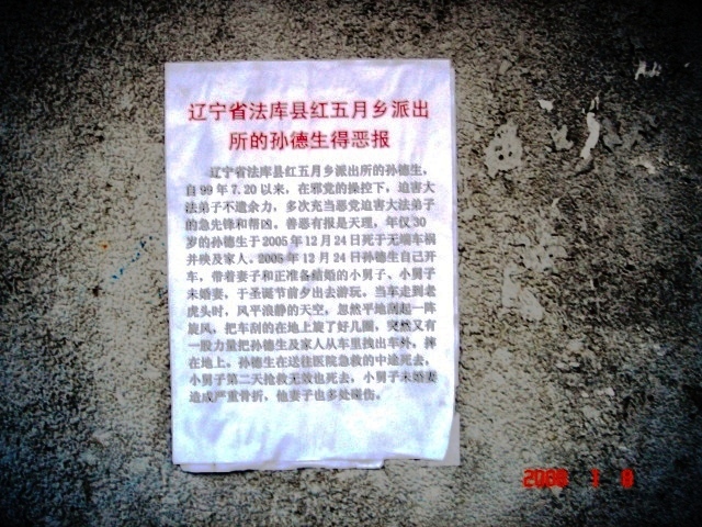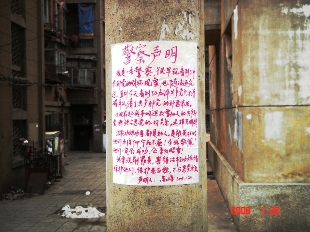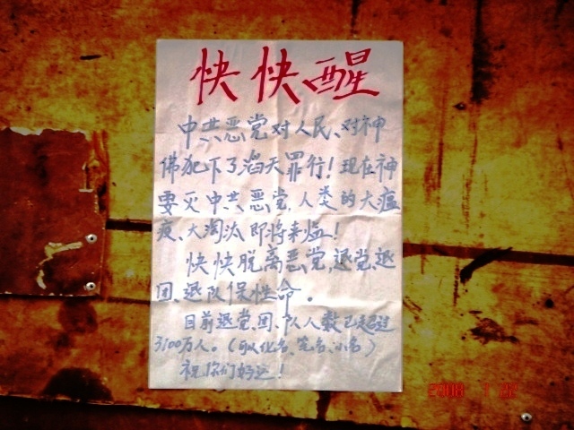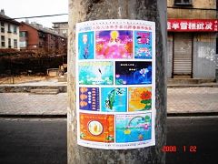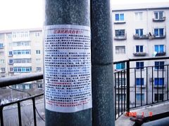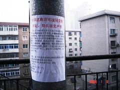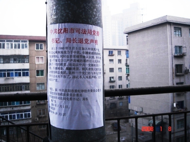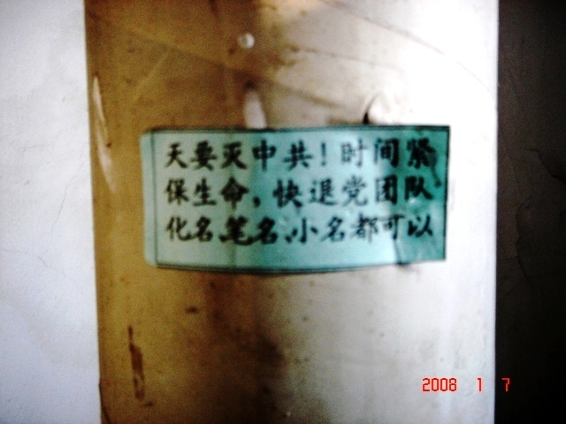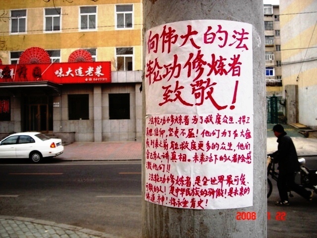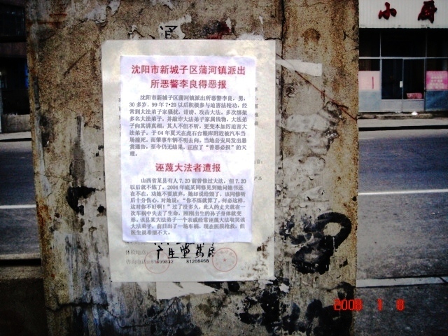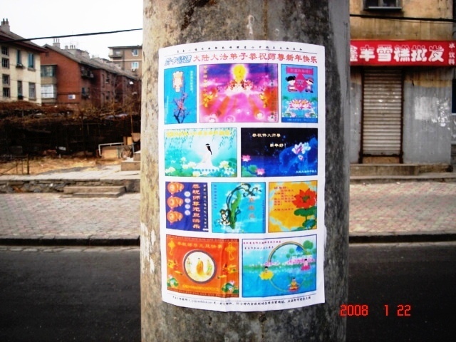 【明慧网二零零八年一月二十五日】在2008年1月,在东北几个大城市的街道电线杆上、家属区的墙壁上、防盗门上出现了大量张贴的真相标语、图片,退