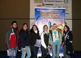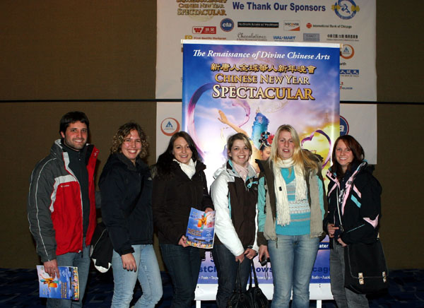 一群来自法国、德国的国际交换学生在散场后久久不愿意离去,在巨大的新年晚会海报前留影,他们表示无意中在大街上接到晚会传单后,很新鲜,没想到在美国还能够看到弘扬中国文化的节目,说起喜欢的节目,都不约而同的表示“大唐鼓吏”的鼓手们真是威风,有威力(Powerful),有活力。就是很遗憾今年夏天他们就要回到自己的国家去了,明年无法看到这么漂亮的演出,但当得知神韵巡回艺术团还会到欧洲表演,他们更惊讶了,都高兴的说“一定去看!”