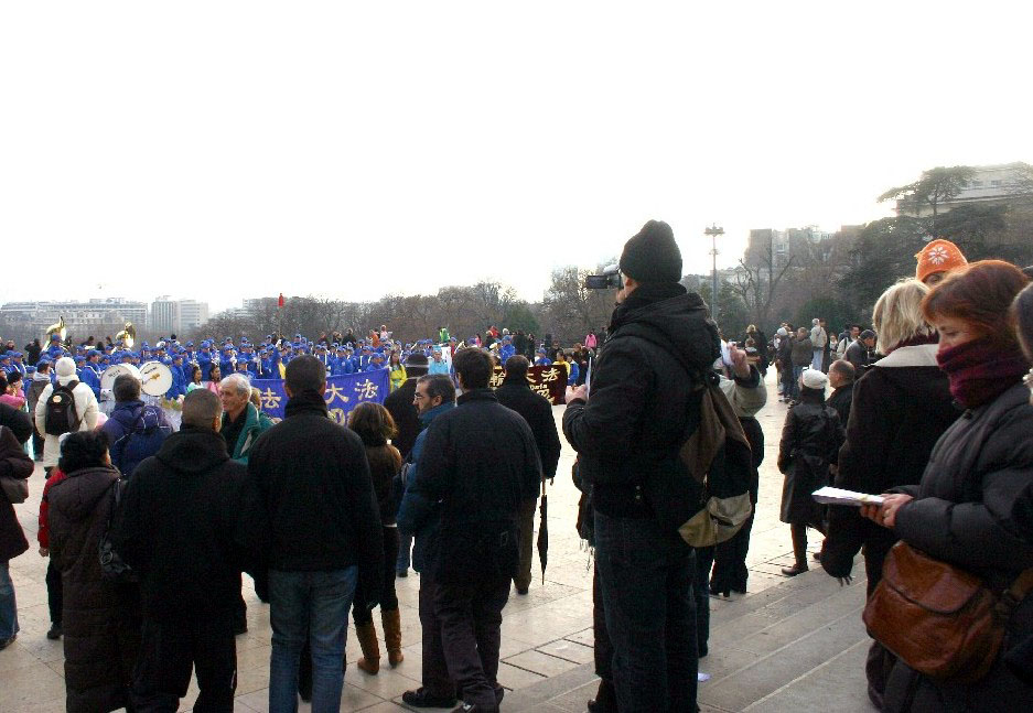 参加完规定的演出后,参加表演的大法弟子登上自由与人权广场,在那里向师父拜年,恭祝师尊新年好。然后,天国乐团为游人加演了曲目,赢得了人们的喜爱与掌声。